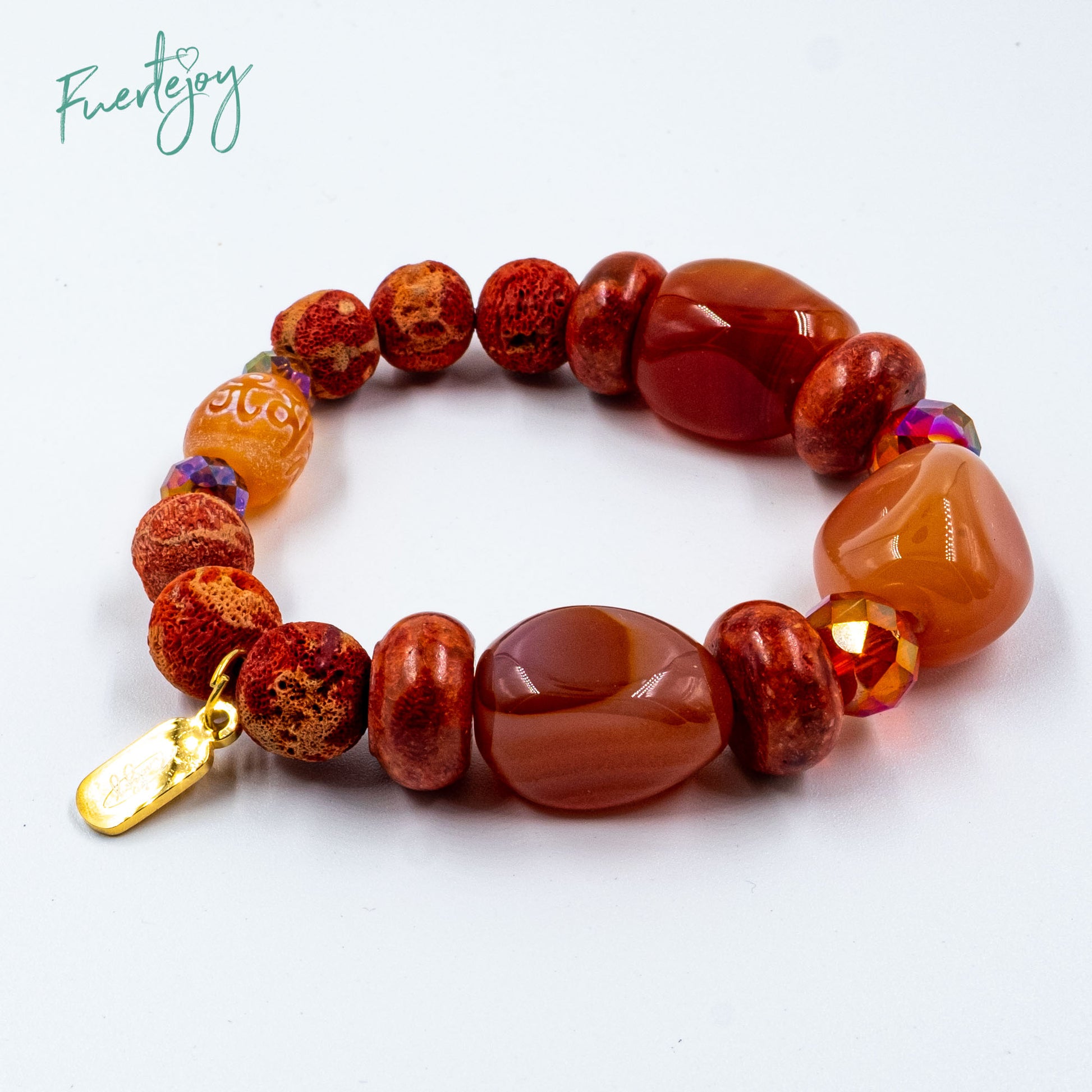 This stylish bracelet is made of foam coral with carnelian and faceted glass beads.