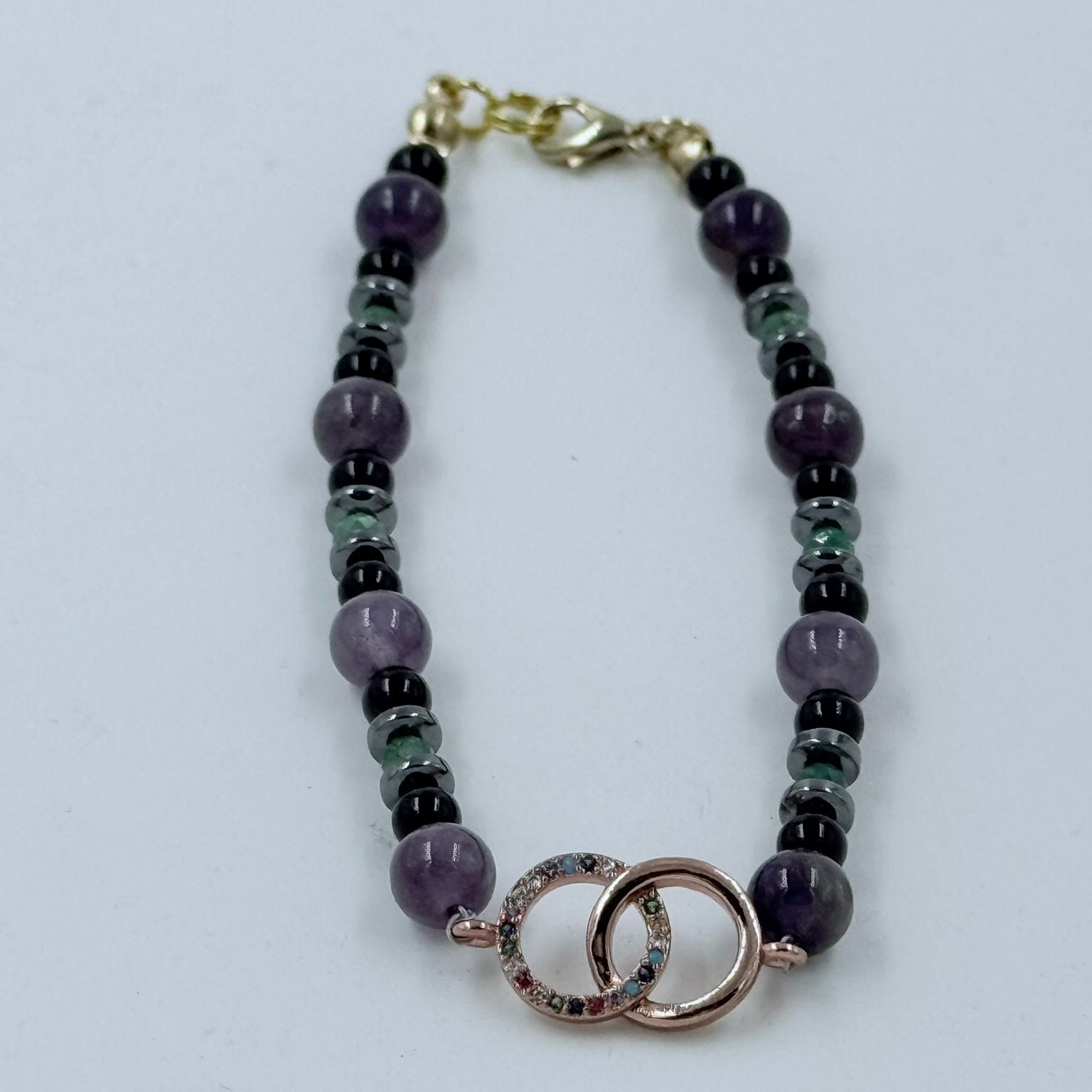 "Eternal Rose Balance" embodies the gentle lightness of Fuerteventura – a delicate bracelet that strengthens your inner balance. The amethyst (element air) brings clarity, peace, and focus to your thoughts, while onyx and hematite (element earth) stabilize and ground you, giving you renewed strength . A small emerald shines in the center, a stone full of heart energy, also associated with air, providing you with fresh, inspiring power.