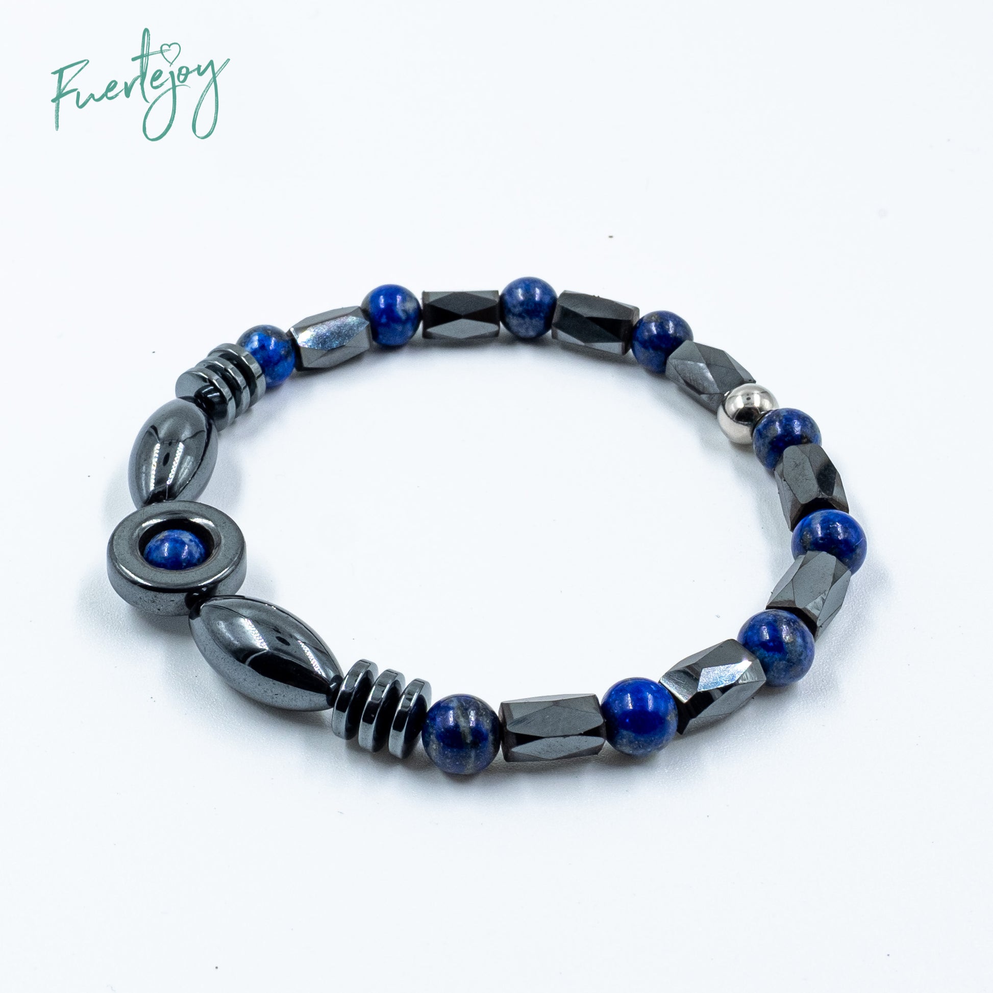 Esta delicada pulsera para mujer cautiva por su elegancia, combinando hematita, magnetita y lapislázuli. Las cuentas de hematita más grandes están dispuestas en un círculo central, creando un impactante punto focal.