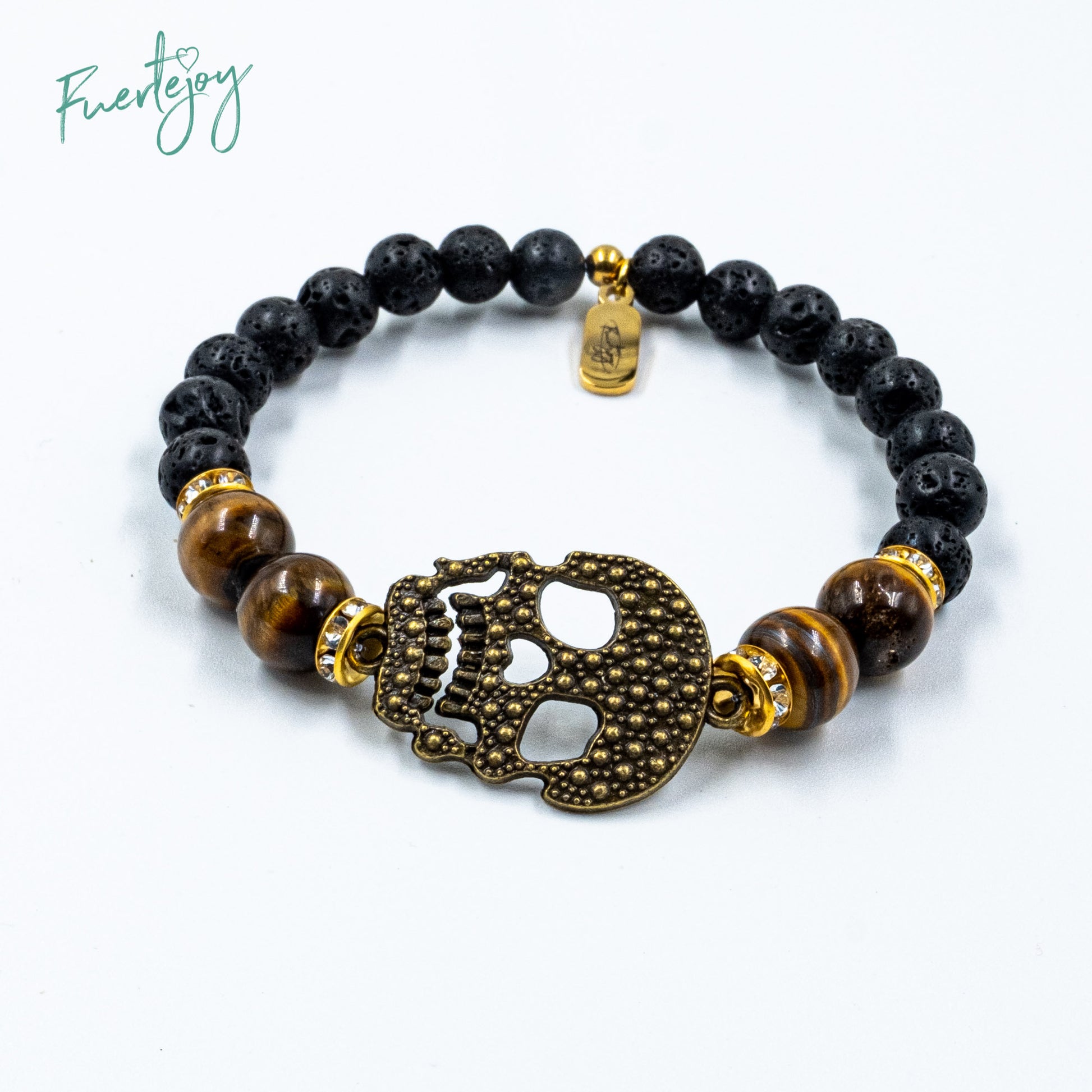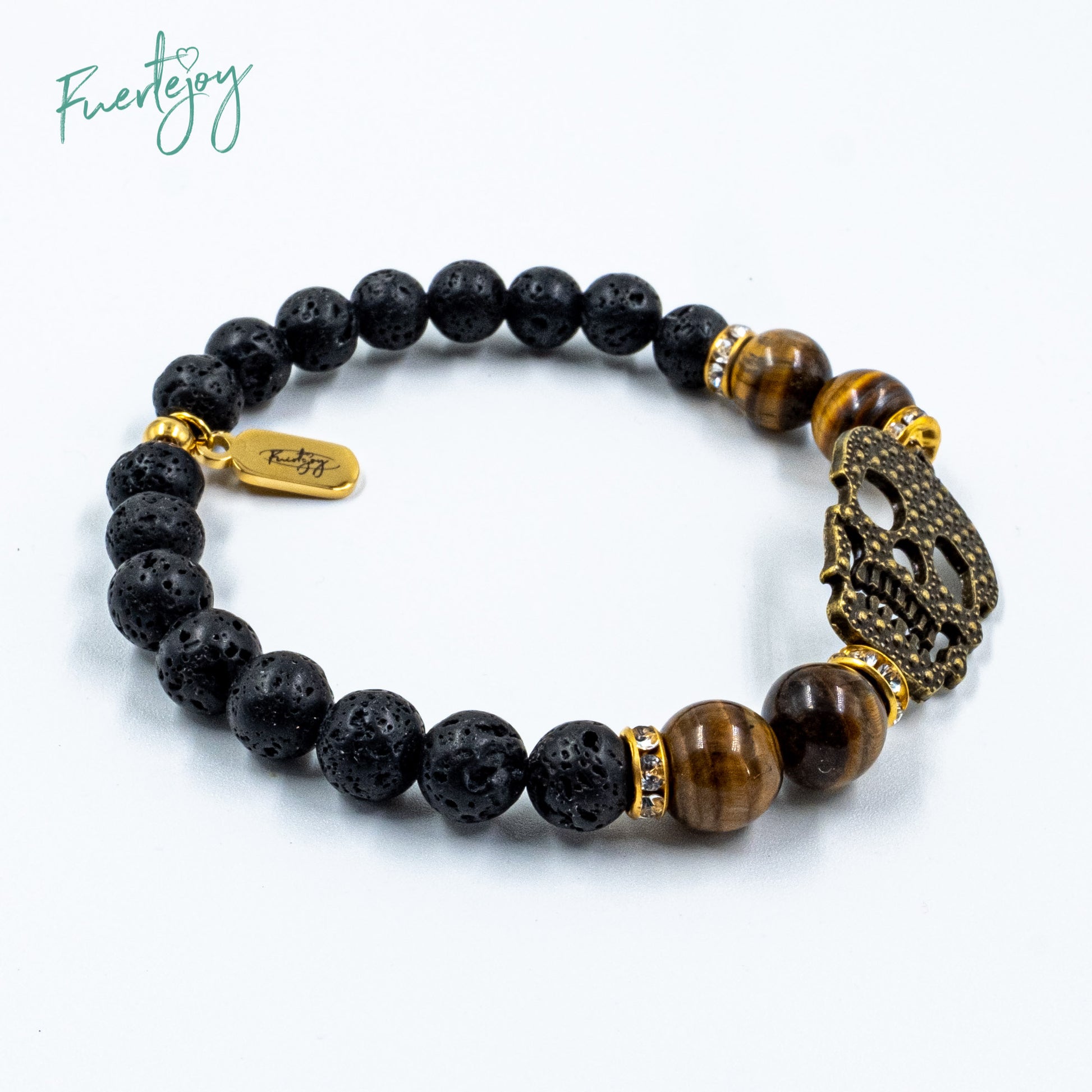 Esta moderna pulsera de Fuertejoy está diseñada a partir de cuentas de lava negra en combinación con la piedra semipreciosa ojo de tigre, elementos de diamantes de imitación y un amuleto de calavera de color bronce.