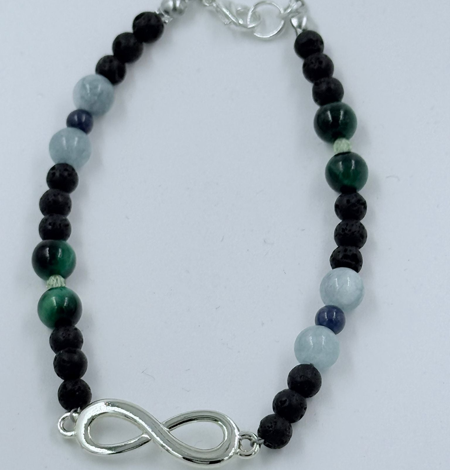 Die Farbkombination aus grünem Tigerauge, Olivin/Nephrit, Aquamarin und Lapislazuli verbindet alle vier Elemente – Feuer, Erde, Wasser und Luft – zu einem harmonischen, kraftvollen Begleiter.