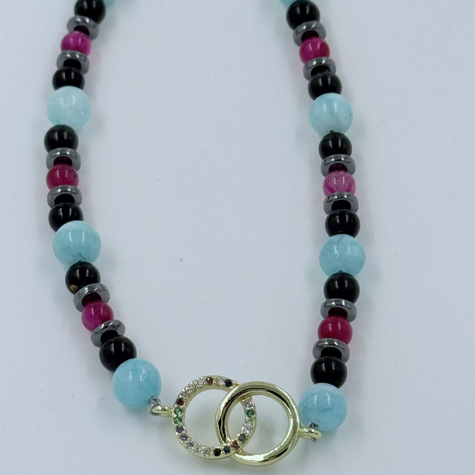 Dieses elegante, goldfarbene Doppelring-Armband vereint türkise Calcedon-Perlen (Wasser), Onyx (Erde), pinkfarbene Achat-Perlen (Feuer) und kleine Hämatitscheiben. Die ineinander verschlungenen Ringe, verziert mit funkelnden Kristallen, symbolisieren Verbindung, Harmonie und ewige Energie. Die Steine schenken dir Gelassenheit, Schutz, Liebe und innere Balance, während die goldene Farbe Wärme und Eleganz ausstrahlt. Eternal Terra Maris ist das perfekte Geschenk – für dich selbst oder liebe Menschen – ein Schmuckstück, das die Kraft der Elemente und die besondere Energie von Fuerteventura in sich trägt.