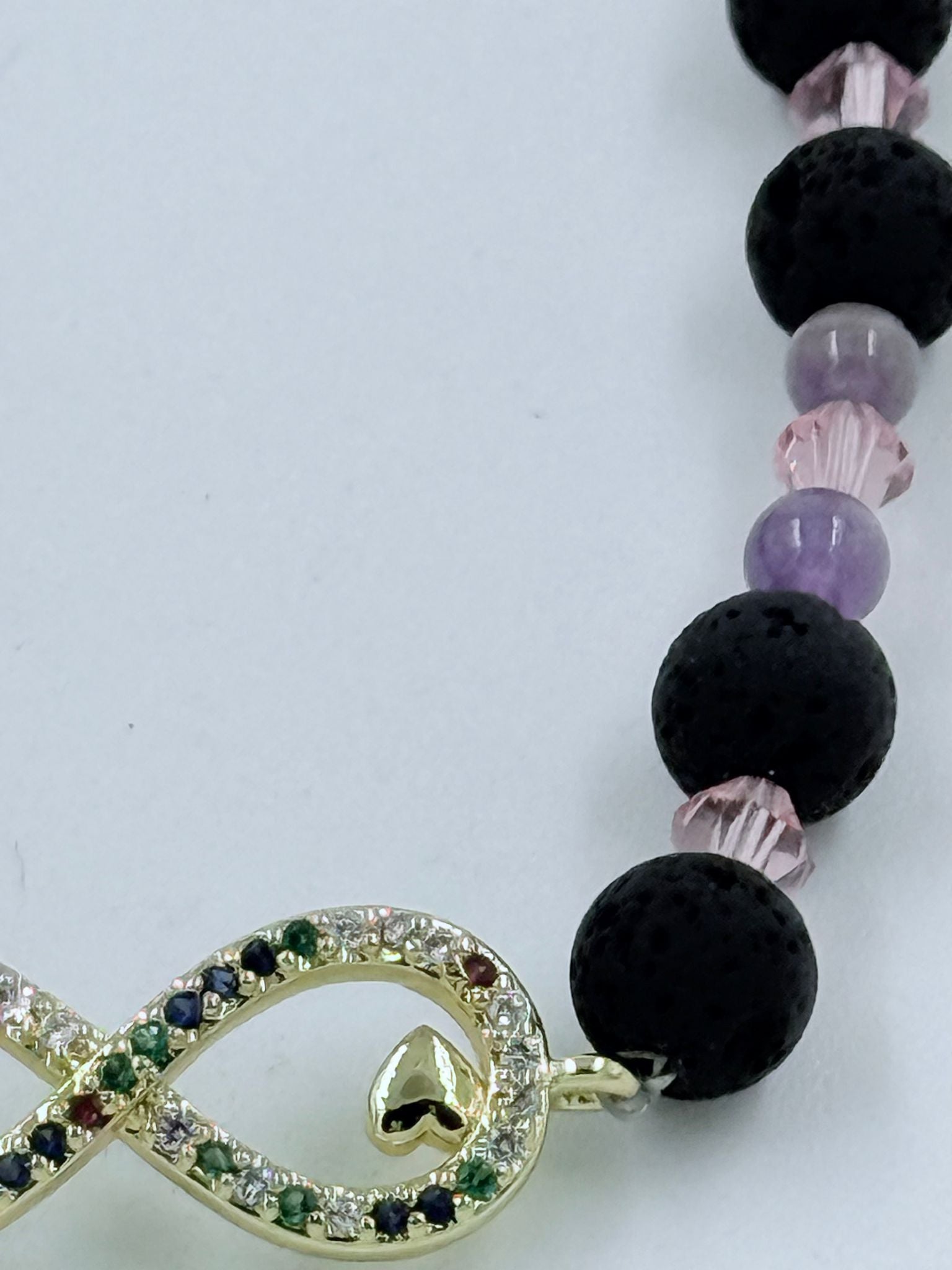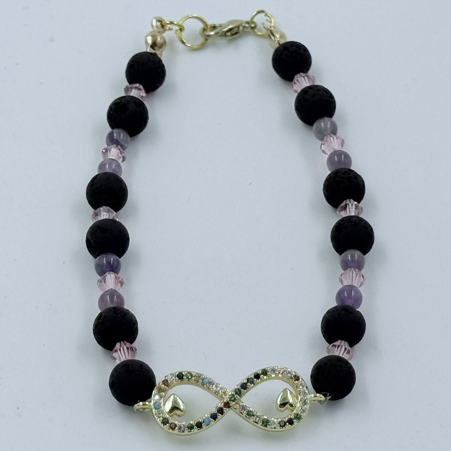 Infinity Aura verbindet alles, was dich stärkt und gleichzeitig weich auffängt: feine, goldfarbene Infinity-Details mit zwei kleinen Herzen, kraftvolle Lava-Perlen, schützenden Amethyst und eine rosafarbene, facettierte Glasperle, die das Armband sanft zum Leuchten bringt.