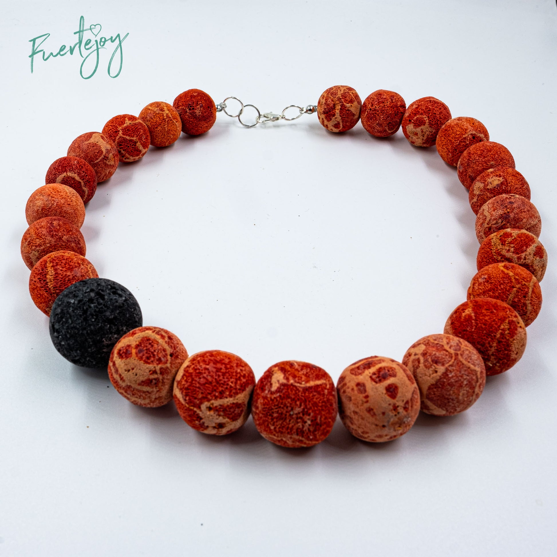 Dieses halsnahe Collier ist besteht aus 20 mm grossen rot-orangen Schaumkorallen kombiniert mit einer 24 mm grossen sehr schönen Lavakugel, die etwas seitlich versetzt in dieser Fuertejoy Kette eingebunden wurde.