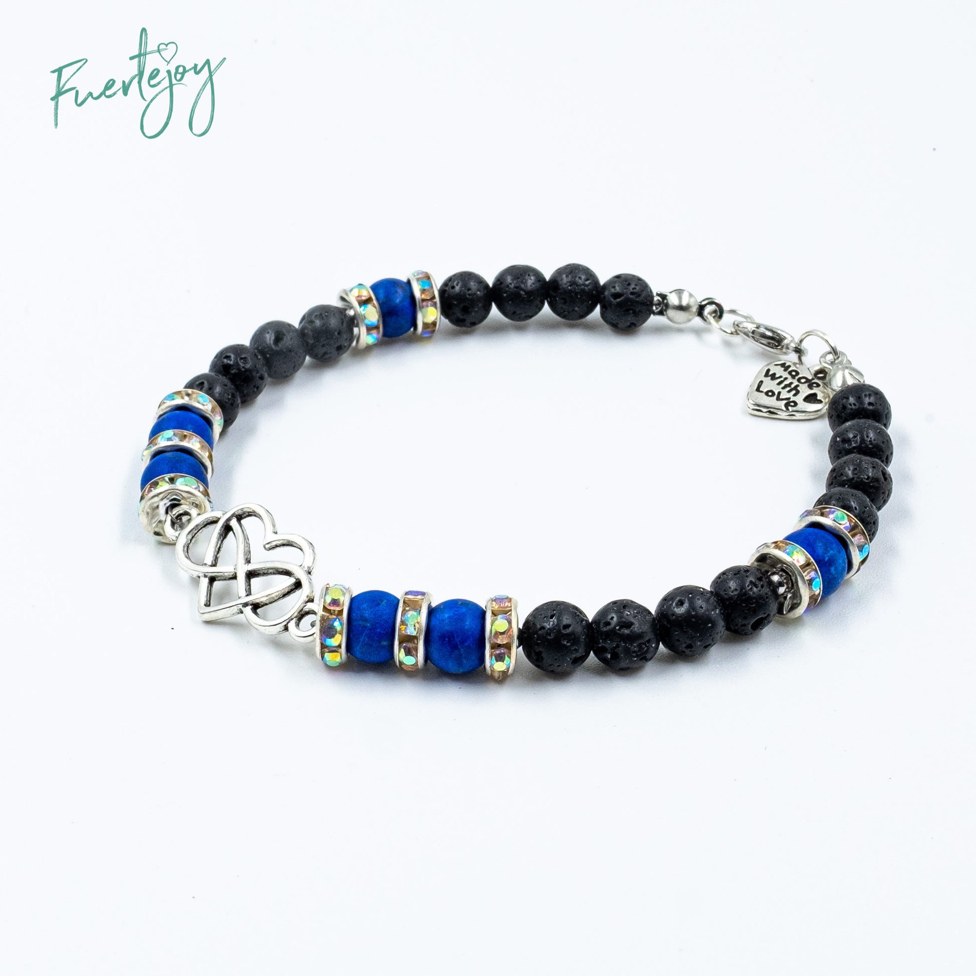 Das Armband ist eine Kombination aus Lava mit Lapislazuli und Strasskomponenten, welche das "Infinitylove" Amulett einrahmen.